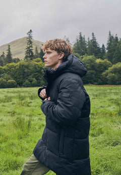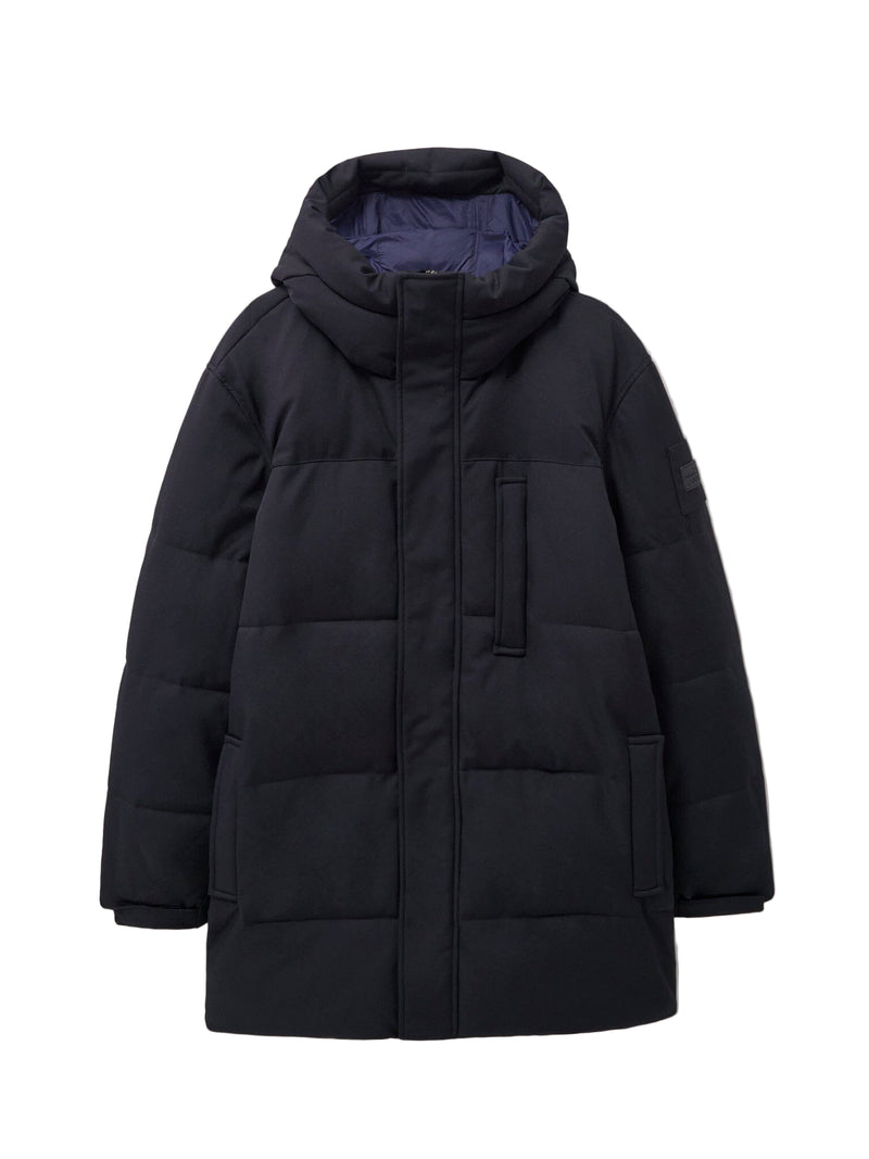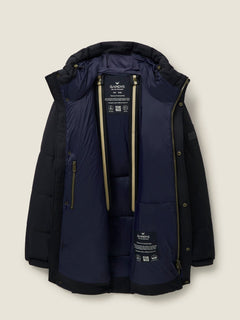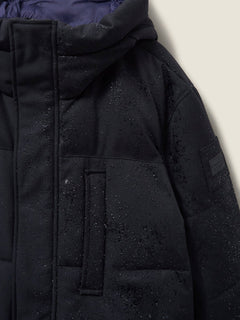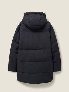 This mid-length puffer jacket is designed with a relaxed fit and a longline silhouette. It is made from a water-resistant polyester outer and includes a padded hood, adjustable cuffs, and secure zip pockets. The reflective wave print provides functional detailing, while internal backpack straps allow the jacket to be carried hands-free when not worn.