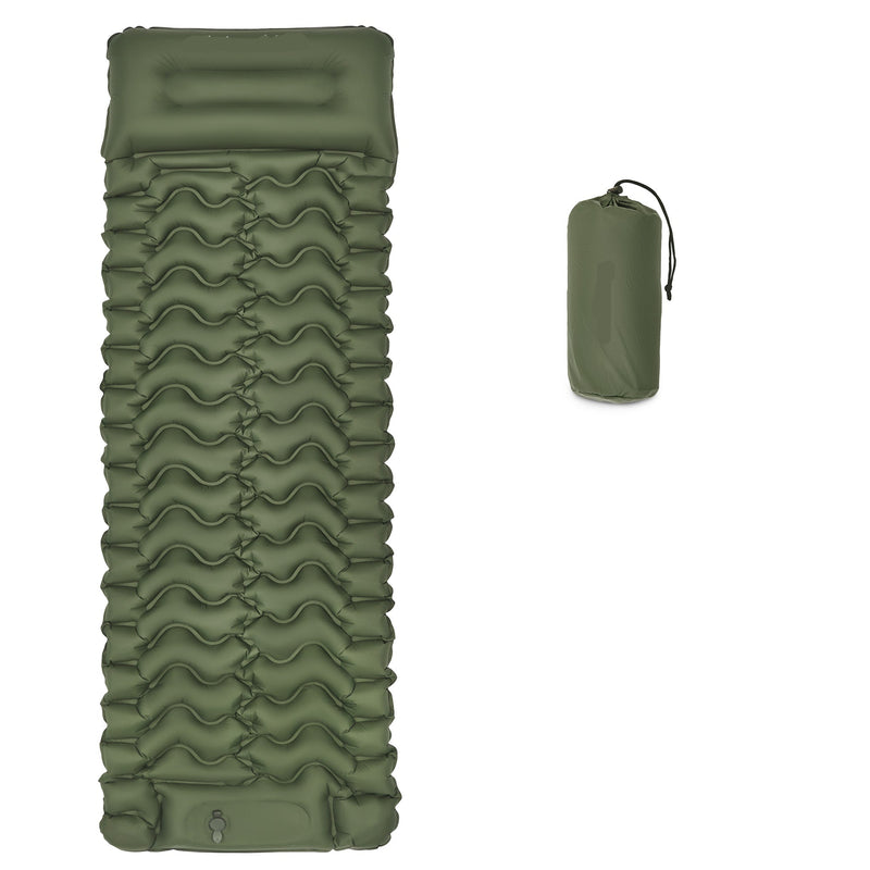 This inflatable sleeping pad is designed for camping, hiking, and backpacking. Made from 40D water-resistant nylon, it provides durability and comfort with an ergonomic headrest and M-shaped air chambers for balanced support. The built-in foot pump inflates the pad in 2–3 minutes without the need for extra tools. With its compact and ultralight design, it packs down small for easy storage and transport.