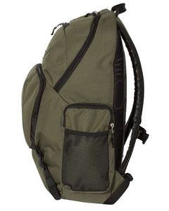 Compartments: Main section, front pocket with organizer panel, side pockets, mesh water bottle holders