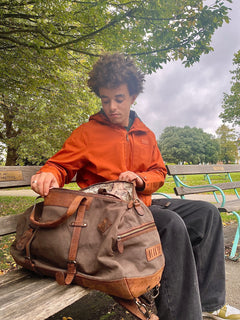 This duffle backpack is made from water-resistant waxed organic cotton with genuine leather trims. It provides multiple carrying options, including a leather top handle and detachable backpack straps. Designed with secure zipper openings, this bag combines practicality and structured storage.